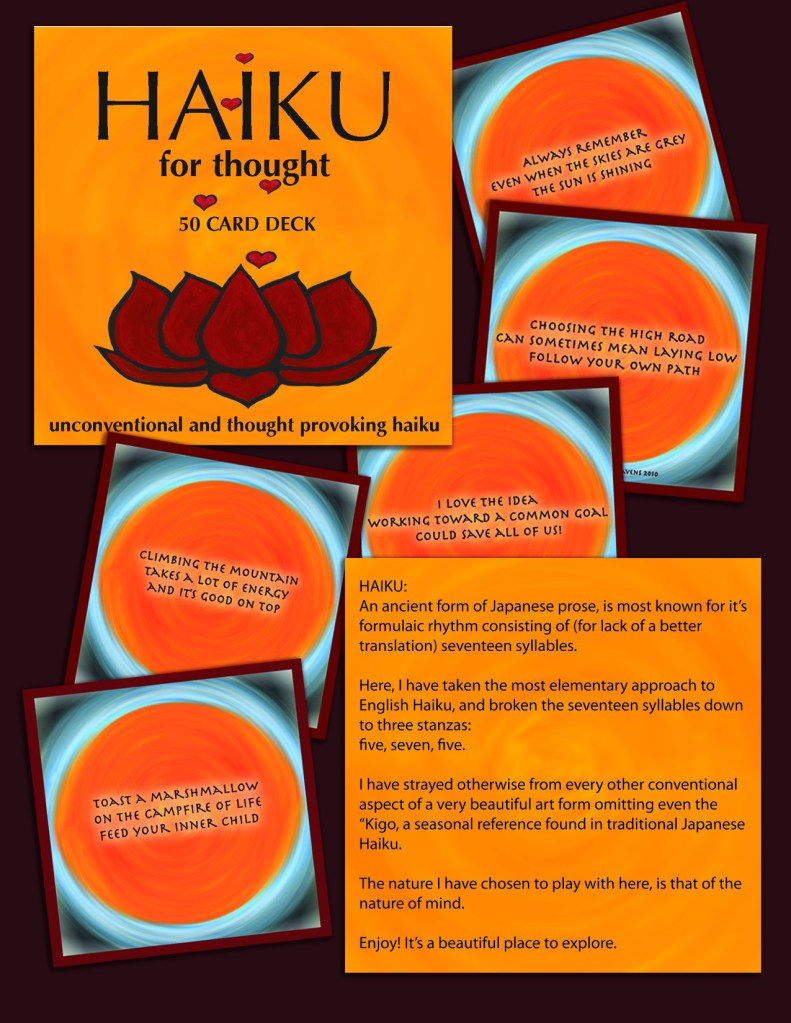 I wrote a lot of poetry in the form of Haiku a couple of years back, and instead of publishing a book, I decided to make an oracular deck (sort of like a tarot deck to simplify the term “oracular”).